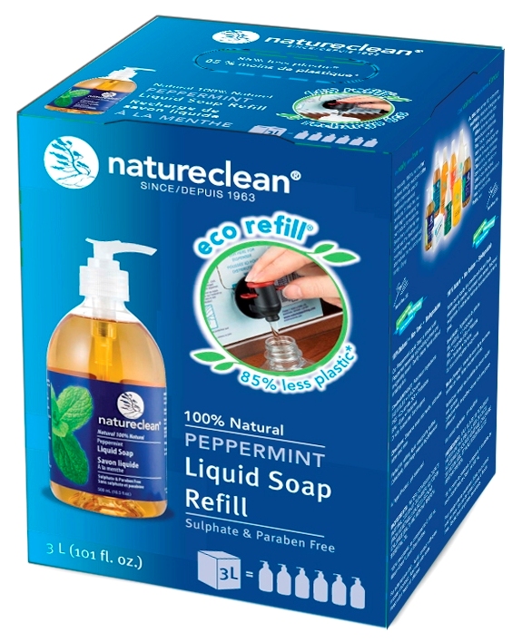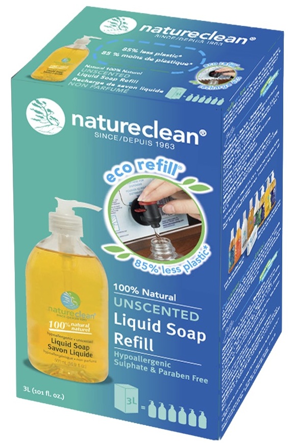 Nature Clean® eco refill® Program!Up to 85% less plastic...Sounds unbelievable right?This innovative concept reduces the plastic sent to landfills, reduces the greenhouse gas emissions released in production and transportation and reduces your carbon footprint. Not to mention it makes refilling easier. The eco refill® is a bag in a box. You've likely seen it before with wine but this is a first in the household cleaning industry. Inside each box is a 3L bag filled with product. There's a dispenser attached to the bag.